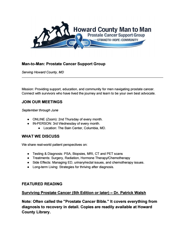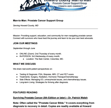 Book: Patrick Walsh, Guide to Surviving Prostate Cancer (available for loan from Man2Man); very comprehensive and readable