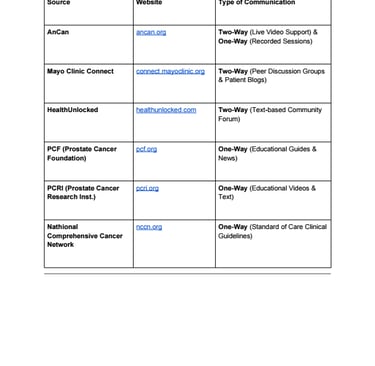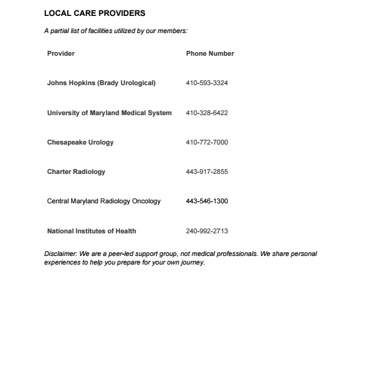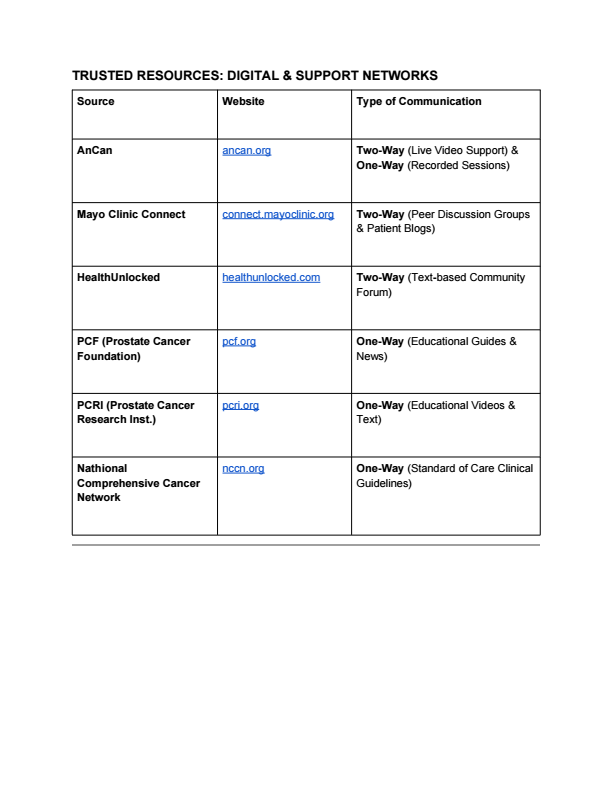 Prostate Cancer Foundation; https://pcf.org Offers free prostate cancer guides, prostate cancer news and other helpful resources for patients and their families, including Information on treatment options, emerging therapies, clinical trials, etc.